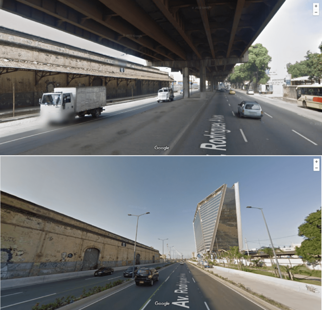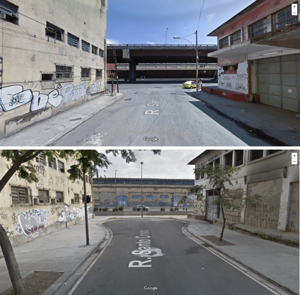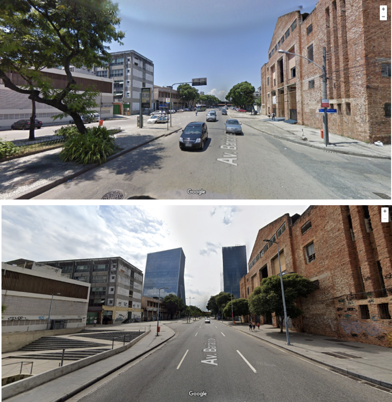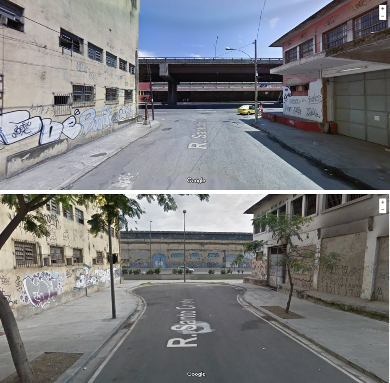 O segundo conjunto de imagens apresenta uma visada a partir de uma rua perpendicular à av. Rodrigues Alves. Neste caso, utilizou-se como exemplo a Rua de Santo Cristo, numa foto do Google Street View tomada em janeiro de 2010, que mostra o Elevado da Perimetral e ao fundo um dos armazéns do Cais do Porto. A imagem evidencia que, apesar do gigantismo da estrutura de concreto e aço do viaduto e, não obstante, a poluição gerada pelo tráfego de veículos, sua altura permite que se veja o armazém e que se possa mesmo acessá-lo, cruzando por debaixo do Elevado. Quando se observa a cena a partir do mesmo ponto, através da figura 9-b, tomada pelo Google Street View em junho de 2017, já não há o viaduto, mas no seu lugar surge a Via Expressa interditando completamente o acesso aos armazéns. Cai por terra, portanto, a estratégia discursiva que afirmava ser a demolição do Elevado da Perimetral a supressão de uma barreira entre a cidade e a Baía de Guanabara. Ressalte-se ainda que a própria via de onde foram tomadas as fotos se transformou num cul-de-sac, já que não seria possível sua conecção à Via Expressa.