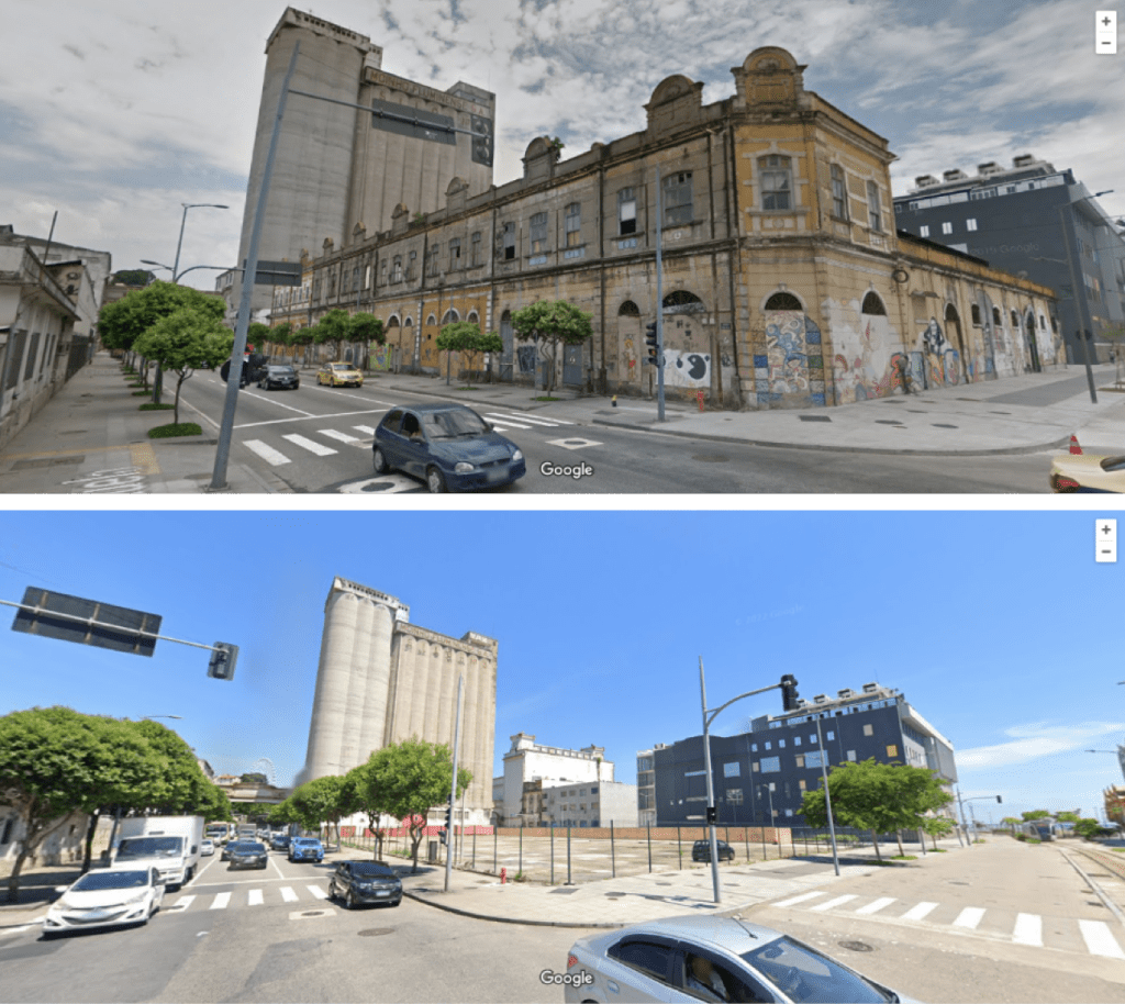 As imagens 12-a e 12-b, tomadas pelo Street View, respectivamente, em dezembro de 2016 e novembro de 2021, documentam o desaparecimento de um conjunto de sobrados localizados na Av. Venezuela, próximo ao Moinho Fluminense. Além do evidente valor histórico e arquitetônico, os sobrados abrigavam há mais de três décadas, o Armazém Cultural das Artes, onde artistas, cenógrafos, carpinteiros, entre outros profissionais, produziram os cenários para mais de três mil produções teatrais. Em paralelo, eram oferecidas oficinas de formação técnica especializada, cumprindo a importante missão de transmitir a tradição do ofício para as novas gerações.