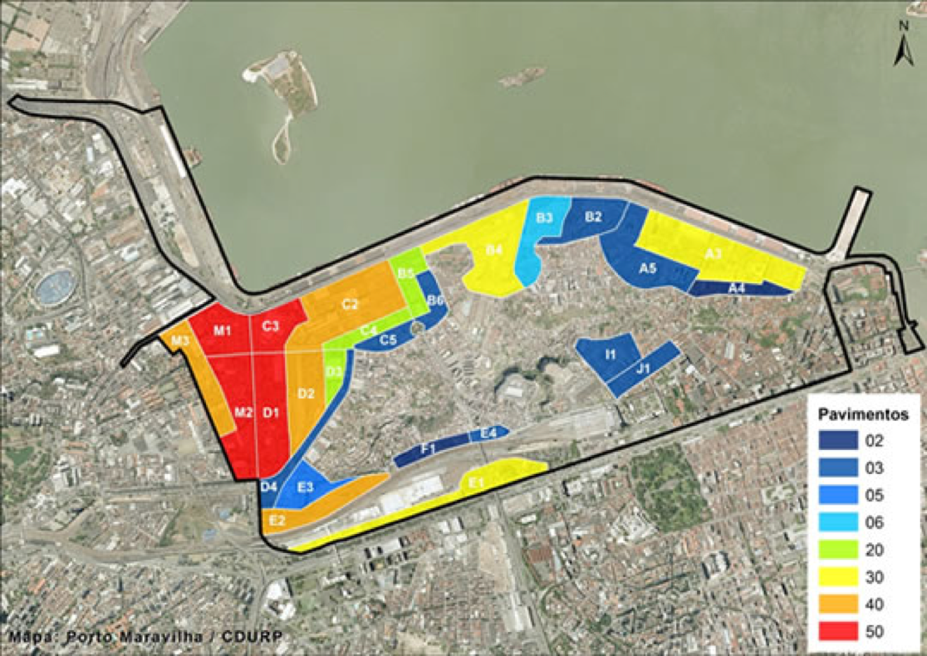 Cabe ressaltar que os subsetores com gabaritos máximos de até 18 metros de altura correspondem ao que estabeleceu a Área de Proteção Ambiental (APA) em parte dos bairros da Saúde, Santo Cristo, Gamboa e Centro, instituída pelo Decreto nº 7.351/1988. Deste modo, de acordo com o Quadro do Anexo V-B, acima referido, dois subsetores permitem gabaritos máximos de 7,5 m e 9,0 metros de altura, que correspondem a uma edificação de até 2 pavimentos; na sequência existem 11 subsetores com gabaritos de 11 metros ou três pavimentos; dois subsetores com gabaritos de 15 metros ou quatro pavimentos; 1 subsetor com gabarito de 18 metros ou cinco pavimentos; a partir daí verifica-se um significativo aumento dos gabaritos máximos permitidos, chegando a 60 metros de altura ou 20 pavimentos em parte de Santo Cristo (subsetores B5, C4 e D3); 90 metros de altura ou 30 pavimentos nas áreas da Saúde, Gamboa e lado par da Av. Presidente Vargas (subsetores A3, B4 e E1); 120 metros de altura ou 40 pavimentos junto à Av. Rodrigues Alves em Santo Cristo e numa área localizada no terreno da Companhia Estadual de Gás – CEG (subsetores C2, D2, E2 e M3); e, finalmente, 150 metros de altura ou 50 pavimentos ao longo da Av. Francisco Bicalho (subsetores C3, D1, M1, M2).