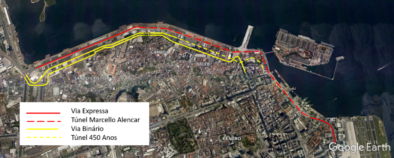 A mera apresentação das principais intervenções propostas pela OUC permite constatar um constrangedor descompasso entre o discurso preservacionista usado na propaganda do Porto Maravilha e os reais objetivos perseguidos por seus promotores. Em nome do combate à “cidade do automóvel”, simbolizada pelo Elevado da Perimetral, foi implementado um programa ultra rodoviarista com a implantação de uma Via Expressa que atravessa indiferente uma área histórica importante da cidade, a construção da Via Binário com duas novas pistas para automóveis, além de dois túneis subterrâneos de grande porte e um túnel escavado no Morro da Saúde, que abriga em seu cume a igreja setecentista dedicada a Nossa Senhora da Saúde.