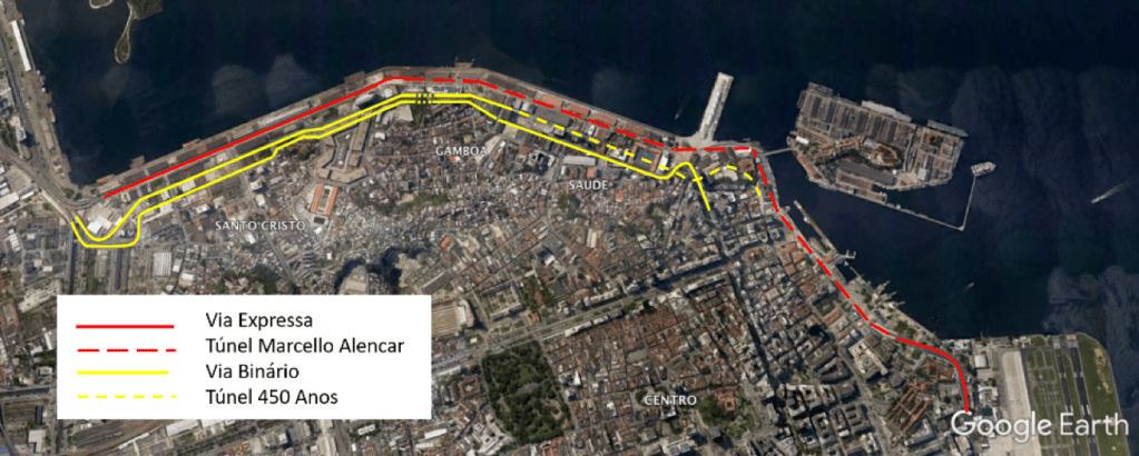 No lugar do Elevado da Perimetral foi implantada uma via expressa com 6 faixas de rolamento que, conectada a um túnel subterrâneo de cerca de 3,4 km de extensão, interliga a Rodoviária Novo Rio às pistas do Parque do Flamengo, junto ao Aeroporto Santos Dumont. O Túnel Prefeito Marcello Alencar, como foi denominado, constitui uma obra de engenharia monumental, tendo sua construção iniciada antes mesmo da conclusão da demolição do viaduto. O túnel possui duas galerias subterrâneas com três pistas cada uma: a galeria que segue no sentido da rodoviária tem capacidade para 110 mil veículos/dia, enquanto que a galeria no sentido Parque do Flamengo, tem capacidade para receber até 55 mil veículos/dia. Considerado o maior túnel subterrâneo no país, foi construído às margens da Baia de Guanabara, na área de aterro que ampliou as instalações portuárias no início do século XX. O túnel atinge no ponto de maior profundidade a cota de 40 metros abaixo do nível do mar, tendo sido dotado de um sistema de drenagem composto por cisterna com capacidade útil para armazenar 390 mil litros de água e quatro bombas, cada uma com capacidade de retirar 100 metros cúbicos de água por hora, com elevados custos de operação e manutenção[6].