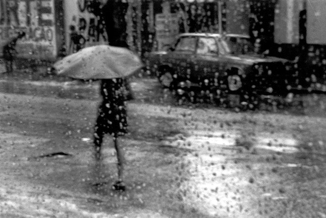 A aproximação das pessoas, forçada pelas circunstâncias, enseja conversas casuais debaixo das marquises das lojas. Comenta-se a chuva, contam-se casos, fala-se sobre a vida, sonha-se de olhos abertos, enquanto se assiste a cidade ser impiedosamente lavada. Há que se esperar, naquele intervalo em que os relógios deixam de controlar os tempos dos afazeres cotidianos, que a chuvarada cesse e o céu se abra outra vez. Em geral, a chuva de verão não dura mais que dez ou quinze minutos.